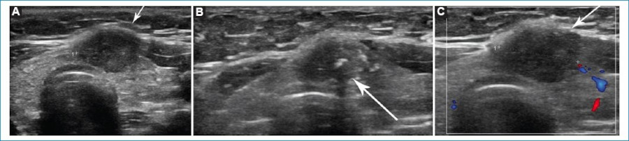 Las características ecográficas sugerentes de malignidad son la presencia de nódulo sólido solitario, hipoecoico, de localización subcapsular, márgenes irregulares o difusos, crecimiento invasivo, naturaleza heterogénea, presencia de microcalcificaciones, flujo intranodular con el Doppler color y ganglios regionales sospechosos2,3,5),(6),(7.