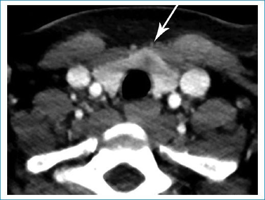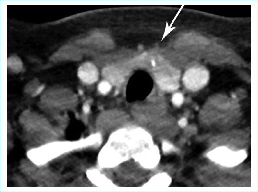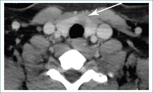 Se indica tomografía computada (TC) de cuello y tórax para determinar afectación regional y a distancia, donde se evidencia la imagen nodular en tiroides con las mismas características descriptas en el estudio ecográfico, sin encontrar lesiones pulmonares ni adenopatías (Figs. 2, 3, 4).