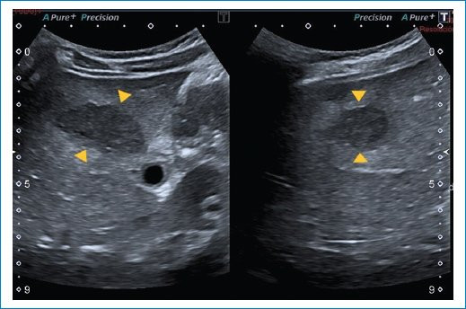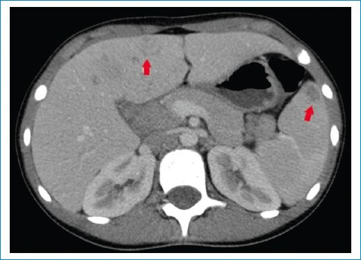 Para realizar el diagnóstico de EAG se utilizan pruebas serológicas que detectan la presencia de anticuerpos contra B. henselae4,8. A nuestra paciente se le realizaron pruebas de anticuerpos B. henselae IGG e IGM cuyo resultado fue positivo (1/1.280). Los estudios de imágenes poco aportan ante cuadros de EAG típico, podemos encontrar en la evaluación ecográfica ganglios linfáticos aumentados de tamaño con pérdida de su ecoestructura habitual, generalmente con necrosis central y asociados a edema circundante. Sin embargo, en pacientes con enfermedad atípica o diseminada se han asociado hallazgos característicos que pueden ser útiles para establecer el diagnóstico como la formación de múltiples granulomas hepáticos y esplénicos, con o sin hepatoesplenomegalia, identificados mediante ecografía y TC3. Estos granulomas se identifican inicialmente como lesiones hipoecoicas en ecografía, y en algunos casos presencia de calcificaciones en las fases tardías. En TC presentan características similares a cualquier absceso, hipodensos, redondeados o con morfología en racimos y tras la administración del contraste pueden permanecer hipodensos o mostrar un realce periférico característico. La multiplicidad y el compromiso de varios órganos se relacionan más con infecciones bacterianas, a diferencia de las de origen parasitario, lo cual nos orienta a un mejor diagnóstico.