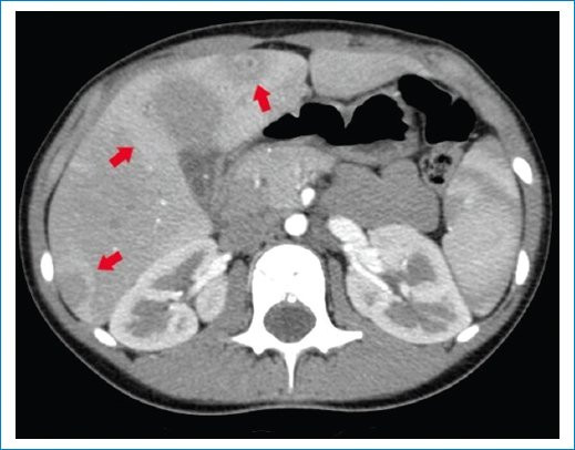 En el tratamiento de esta entidad se ha informado la susceptibilidad de varios agentes antimicrobianos, considerándose la máxima actividad para las cefalosporinas de tercera generación1,3. La paciente fue internada para recibir esquema antibiótico endovenoso con evolución satisfactoria; los controles ecográficos posteriores mostraron reducción del tamaño y número de las lesiones hepáticas.
