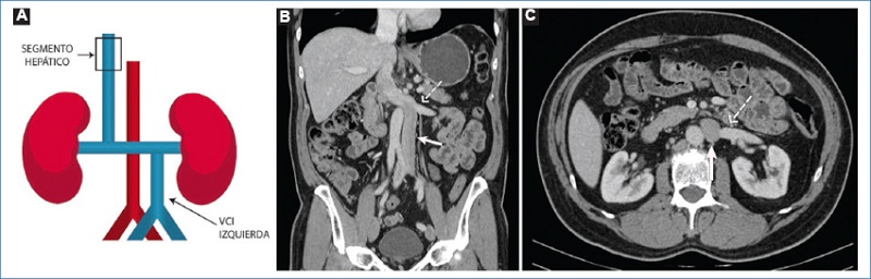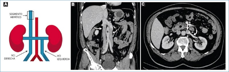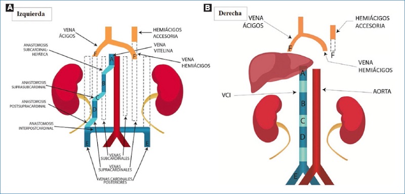 La VCI definitiva se compone de cuatro segmentos: hepático, suprarrenal, renal e infrarrenal. La génesis de la VCI involucra diferentes procesos que incluyen formación de anastomosis y regresiones de estructuras venosas embrionarias3. Las anomalías congénitas de la VCI son resultado de la persistencia o regresión anómala de estas estructuras venosas fetales9.