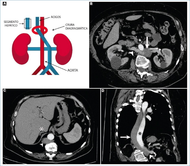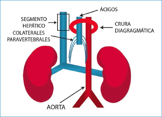 Se produce como consecuencia de una falla embriológica al formar la anastomosis subcardinal derecha hepática. La VCI suprarrenal drena en el sistema ácigos-hemiácigos para retornar al corazón a través de la vena cava superior. Debido a la ausencia del segmento intrahepático de la VCI, las venas suprahepáticas desembocan de manera directa a la aurícula derecha3 (Fig. 5). La vena ácigos suele estar dilatada y puede simular una masa paratraqueal o adenopatías retrocrurales10,15. También hay que considerar la posibilidad de una ligadura accidental durante el contexto de una cirugía torácica, que desencadenaría en un evento fatal para el paciente10. Es imperativo tener en cuenta esta variante previa planificación de un bypass cardiopulmonar10,16. La asociación más común con esta anomalía incluye a los síndromes heterotáxicos (isomerismo izquierdo) y la malrotación intestinal17.