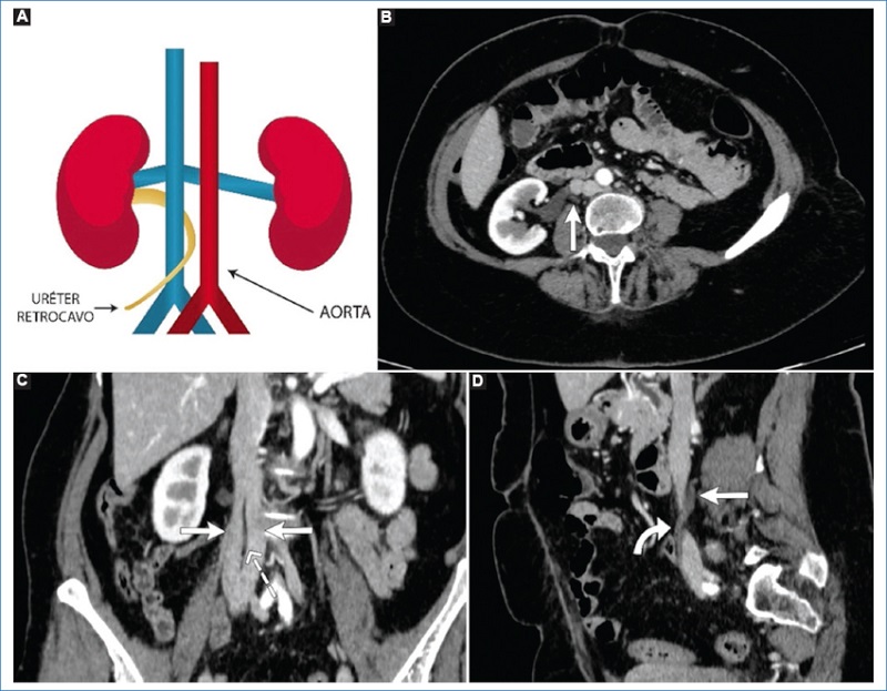 A diferencia de la anatomía habitual de la VCI infrarrenal que surge de la vena supracardinal derecha (localizada posteromedial con respecto al uréter homolateral), en esta entidad la VCI infrarrenal se desarrolla a partir de la vena cardinal posterior derecha (que discurre anterior y lateral con respecto al uréter). Como resultado, el uréter proximal queda confinado posteriormente con respecto a la VCI, pudiendo generar compresión y consecuente hidronefrosis y/o infecciones urinarias recurrentes (Fig. 6)16. Tiene una prevalencia del 0,06 al 0,17%, ocurriendo más comúnmente en hombres, del lado derecho10,18.