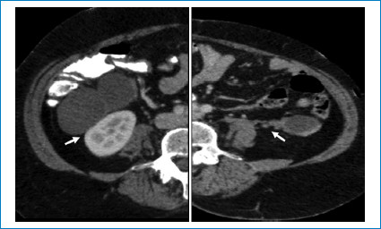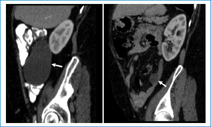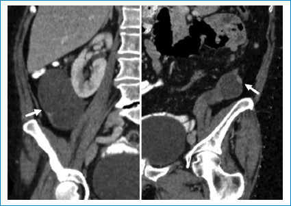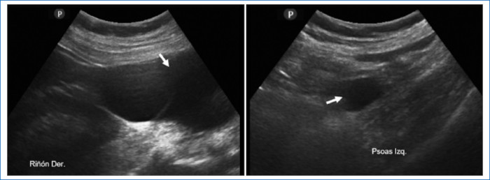 Presentamos el caso de una mujer de 70 años que acude a consulta ambulatoria por presentar dolor abdominal leve con predominio en flanco izquierdo. Como antecedentes relevantes fue diagnosticada con carcinoma cérvicouterino hace 30 años, por lo que fue tratada con histerectomía y radioterapia. Se le realizó una ecografía abdominal, la cual informa a nivel de ambos flancos al menos tres imágenes quísticas, una de ellas del lado derecho con fino tabique en su interior (Fig. 1). Fue derivada a nuestro servicio, donde se le realizó una tomografía de abdomen y pelvis con contraste endovenoso, donde se evidencian imágenes de aspecto quístico en ambos espacios parietocólicos: del lado derecho en relación con el riñón y del lado izquierdo en íntimo contacto con el músculo psoas (Figs. 2, 3 y 4). Dichas imágenes presentan finos tabiques en su interior, y miden del lado derecho 84 x 64 mm y del lado izquierdo 57 x 34 mm. Hallazgos imagenológicos compatibles con transposición ovárica bilateral con quistes ováricos como complicación y causa de la consulta.