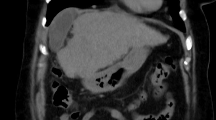 TC de abdomen simple en corte coronal a nivel hepático. Se identifica la posición suprahepática de la vesícula biliar.