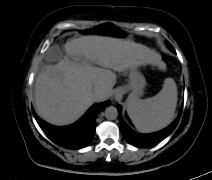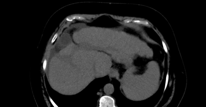 TC de abdomen simple en corte axial. Se observa la vesícula biliar ectópica asociada a escaso líquido libre perihepático.