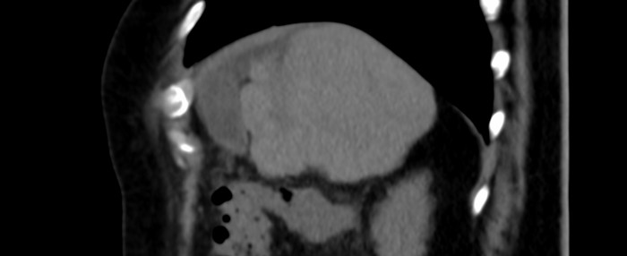 TC de abdomen corte sagital. Se observa la hipoplasia hepática del lóbulo derecho.