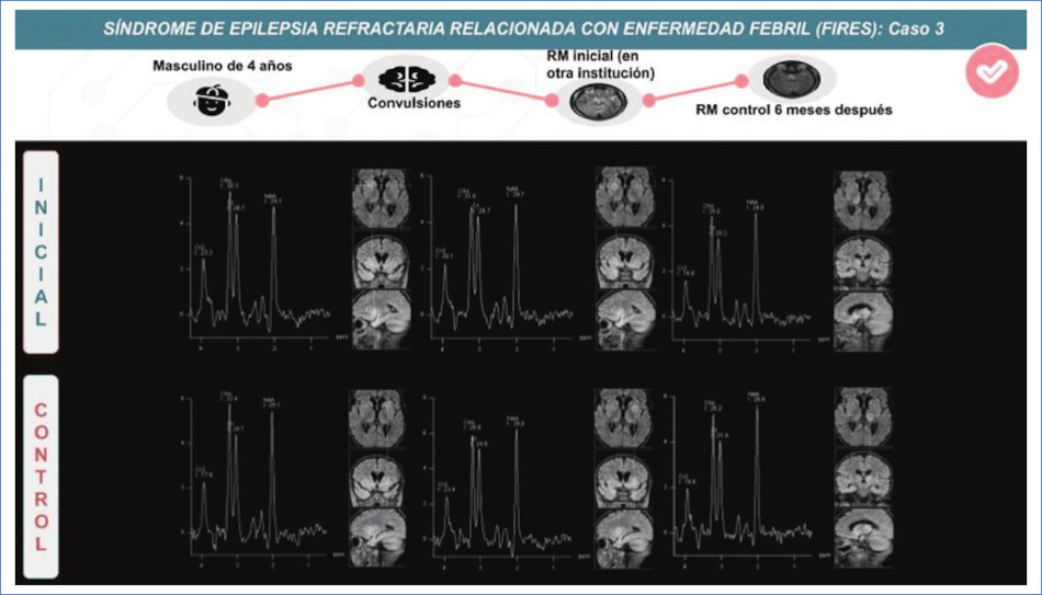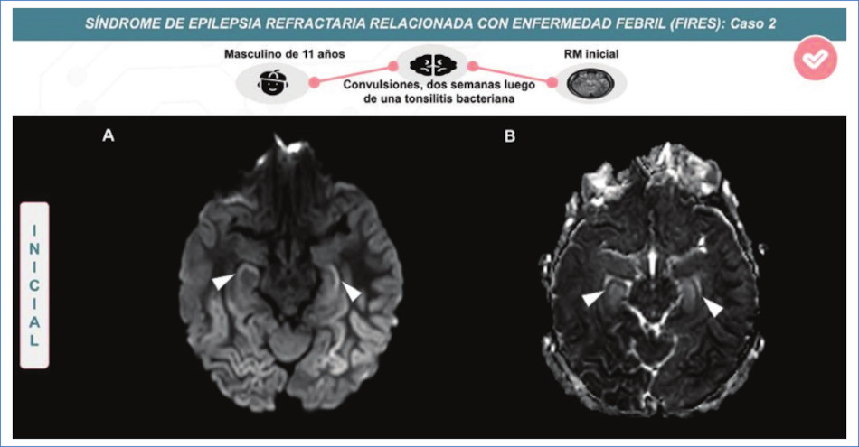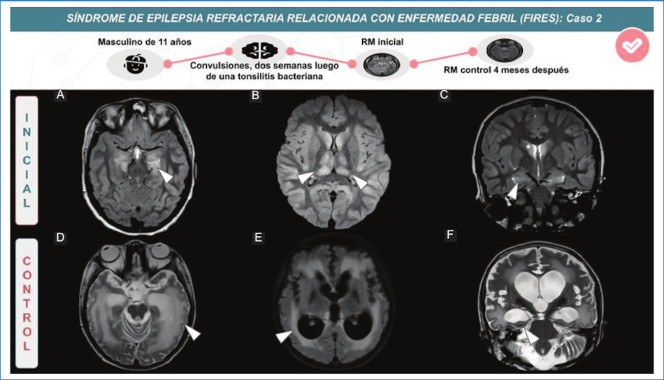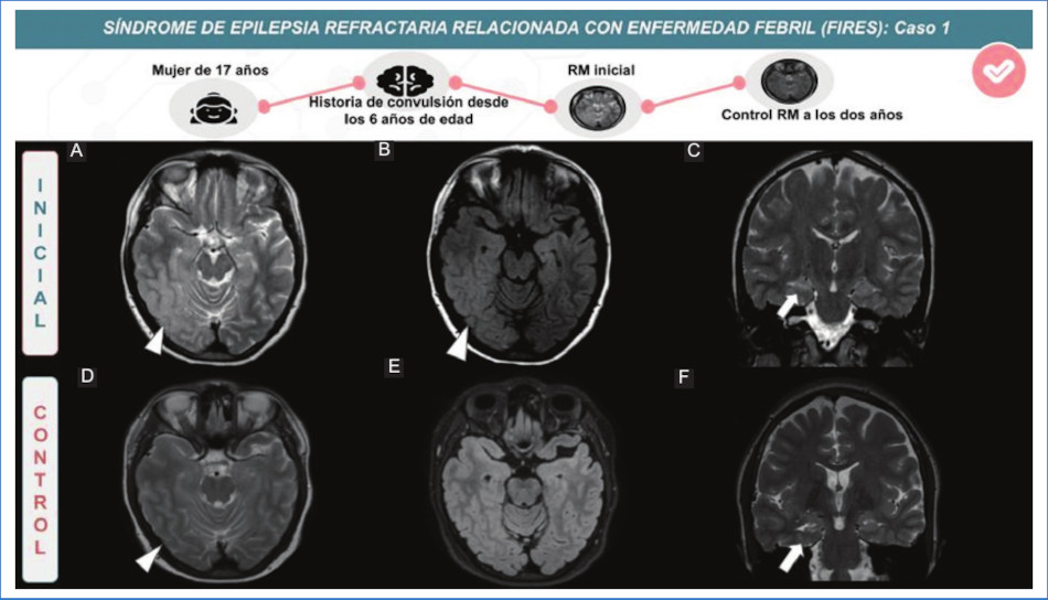 Resumen: El FIRES (síndrome epiléptico relacionado con una infección febril) es un síndrome epiléptico poco frecuente que ocurre a cualquier edad en pacientes previamente sanos. Clínicamente presenta episodios febriles en un periodo de 24 horas a dos semanas previas al inicio del estatus epiléptico. Se consideran dos estadios de la enfermedad: estadio agudo, donde existe refractariedad al tratamiento de las convulsiones durante varias semanas, seguido por un estadio crónico en el cual la epilepsia es intratable, acompañado de diferentes grados de deterioro cognitivo. El estadio agudo se caracteriza por un estudio de resonancia magnética (RM) cerebral normal en la mayoría de los casos. Sin embargo el lóbulo temporal, así como las estructuras temporo-mesiales e hipocampo, pueden verse afectados. En el estadio crónico de la enfermedad, la atrofia difusa y/o esclerosis temporo-mesial unilateral o bilateral puede ser el hallazgo principal; no obstante también es posible una evolución sin lesiones secuelares. Comprender estas anomalías en la RM permite respaldar el diagnóstico de FIRES en el contexto de un paciente con epilepsia refractaria, ya que es un diagnóstico de exclusión.
