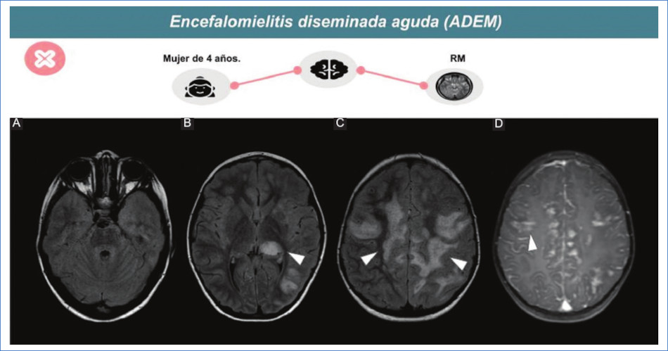 La encefalomielitis aguda diseminada (ADEM) es una enfermedad inmunomediada que produce múltiples lesiones inflamatorias en el cerebro y la médula espinal16.