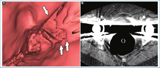 Pueden ser movimientos involuntarios del paciente, peristaltismo intestinal, desplazamientos respiratorios o la pulsatilidad cardíaca, que degradan la calidad de la imagen de forma focal o difusa. El artefacto de movimiento en las imágenes 2D se evidencia como áreas borrosas lineales tenues de atenuación, mientras que en las imágenes endoluminales se manifiesta como áreas lineales de atenuación con un margen irregular en forma de diente de sierra. Para reducir estos defectos es recomendable examinar las imágenes en reconstrucciones multiplanares y evaluar el estudio antes de que el paciente se retire del tomógrafo, logrando así obtener otra adquisición del segmento afectado en caso de ser necesario. Hay que destacar también la importancia de explicar claramente el procedimiento que se realizará al paciente, ya que contar con su máxima colaboración también disminuirá la tasa de errores. La administración de butilbromuro de hioscina (40 mg) resulta útil, ya que reduce el peristaltismo intestinal y por lo tanto también los movimientos durante el procedimiento; en caso de contraindicación, es posible utilizar glucagón (1 mg) en su lugar11.