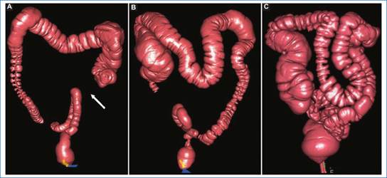 La válvula ileocecal tiene un aspecto variable y ocasionalmente puede simular una masa polipoide en las imágenes endoluminales. Resulta útil visualizar en imágenes 2D el íleon terminal contiguo como referencia.