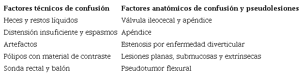En el análisis de la colonografía por TC resulta indispensable la adecuada identificación de los artefactos y las pseudolesiones que puedan encubrir una verdadera patología para evitar un diagnóstico erróneo y un consecuente tratamiento innecesario.