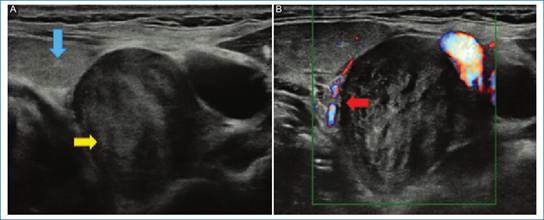Los hallazgos sugerían un quiste complicado de la segunda hendidura branquial. Sin embargo, el resultado histopatológico de una biopsia obtenida por aguja gruesa (BAG) guiada por ecografía indicó: proliferación mesenquimal de estirpe neural con inmunohistoquímica positiva para proteína S-100. Teniendo en cuenta el tipo de elemento neoplásico observado y la positividad para marcadores de origen neural, fue compatible con schwannoma parafaríngeo.