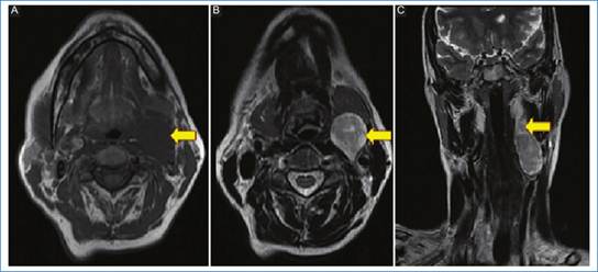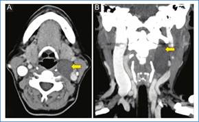 Presentamos el caso de una mujer de 56 años de edad que acude a consulta por masa cervical izquierda con dolor constante y dificultad deglutoria de varios meses de evolución.
