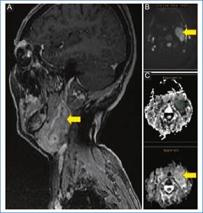 -Resonancia magnética (RM). Tumoración laterocervical de bordes bien definidos de 3 x 2,5 x 6,5 cm de tamaño (anteroposterior x transverso x longitudinal) medial al espacio carotídeo, desplazando lateralmente a las estructuras cervicales. Es hipointensa ponderada en T1 y heterogénea de predominio hiperintensa ponderada en T2 (Fig. 3), sin captación en fase arterial de estudio dinámico con CIV (Fig. 4A) y sin restricción en difusión con valor de coeficiente de difusión aparente (ADC) alto, de 1,7 mm2/s (Fig. 4 B y C).