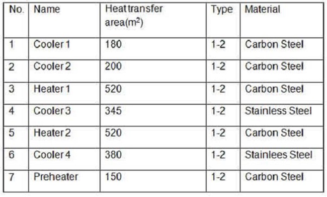 Figure 3 describes the heat exchanged and the auxiliary service consumption of each of the shell and tube heat exchangers used in the process. For the type of heat exchanger in relation to the number shown in Figure 3, please refer to Figure 2.