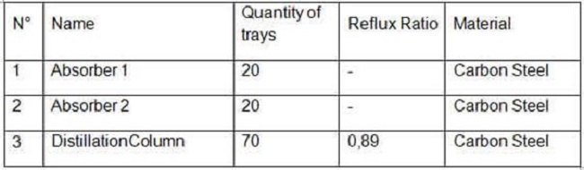 The Peng-Soave-Redlich-Kwong (PSRK) thermodynamic model with vapour phase association was chosen to carry out the simulation, according to suggestions and indications provided by the ChemCAD® simulator itself through the use of the "Thermodynamics Wizard" option. This is due to the fact that the temperature and pressure limit values used throughout the production process were taken into account, as well as the types of chemical substances being processed.