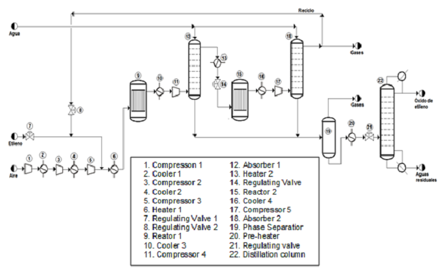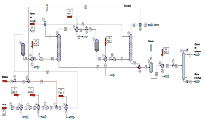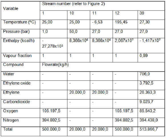 Figure 2 shows the flow chart obtained during the simulation of the EO production process from the catalytic oxidation of ethylene in the ChemCAD® simulator.