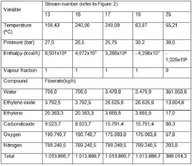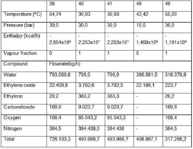 The output stream from Reactor 1 (No. 17) contains EO (26,625.6 kg/h) at 2.63 %; ethylene (3,665.5 kg/h) at 0.36 %; carbon dioxide (15,791.4 kg/h) at 1.56 % and water (3. 479.9 kg/h) by 0.34 %, the main chemical compounds found in this stream being nitrogen (789,240.5 kg/h) with 77.85 % and oxygen (175,063.8 kg/h) with 17.26 %. It is worth noting that 22,833.1 kg/h of EO are formed in the first reactor, and 16,697.8 kg/h of ethylene are consumed.