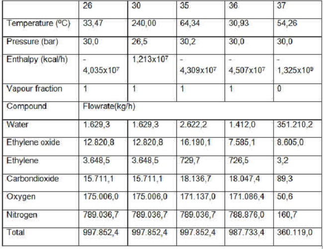 In Absorber 1, 51.85 % of the EO is absorbed, i.e. of the 26,625.6 kg/h of EO fed to this equipment, 13,804.8 kg/h are absorbed by the wash water, while the rest (12,820.8 kg/h) leave through the gas stream of the buffer (No. 26). Reactor 2 receives 997,852.4 kg/h of a gaseous stream (No. 30) consisting of nitrogen (789,036.7 kg/h) at 79.08 %; oxygen (175. 006.0 kg/h) by 17.53 %; carbon dioxide (15,711.1 kg/h) by 1.57 %; EO (12,820.8 kg/h) by 1.28 %; ethylene (3,648.5 kg/h) by 0.37 % and water (1,629.3 kg/h) by 0.16 %. In the second reactor, 2,918.8 kg/h of ethylene are consumed and 3,369.3 kg/h of EO are produced, resulting in an output gas stream (No. 35) consisting of 79.08 % nitrogen (789. 036.7 kg/h); 17.15 % oxygen (171,137.0 kg/h); 1.82 % carbon dioxide (18,136.7 kg/h); 1.62 % EO (16,190.1 kg/h); 0.26 % water (2,622.2 kg/h) and 0.07 % ethylene (729.7 kg/h).