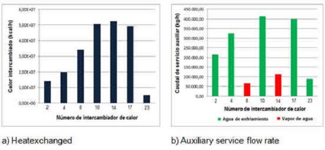 Regarding the auxiliary service flow required, of the heat exchangers that consume cooling water, number 10 is the one that needs the highest flow of this service (412,569.52 kg/h), as it is where the greatest amount of heat is exchanged (5.06x107 kcal/h). The one that needs the least flow of cooling water is number 23, with 89,653.48 kg/h, as it is where the least amount of heat is exchanged in the whole process, as it was previously established. Finally, of the heat exchangers that consume water vapour, number 14 is the one that requires the largest amount of steam (112,857.63 kg/h), as this is where the largest amount of heat is exchanged of all the heat exchangers (5.25x107 kcal/h), as mentioned above.