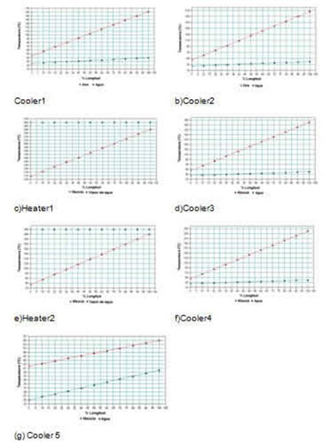 Heat curves were obtained for each of the shell and tube heat exchangers used in the production process, in order to observe the relationship between the temperatures of both fluids with the length of the heat exchanger, thus obtaining a spatial temperature profile that describes the thermal behaviour of the heat exchange process with respect to the length of the equipment. This was done using the "Heat Curves" option contained in the ChemCAD® simulator, thus obtaining 7 heat curves.