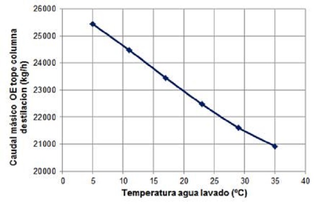 A sensitivity study was carried out to evaluate the influence of increasing the feed temperature of the wash water to each of the absorbers on the amount of ethylene oxide to be obtained by the current at the top of the distillation column. In this case, the feed temperature of the wash water was varied in the range of 5 - 35 ºC.