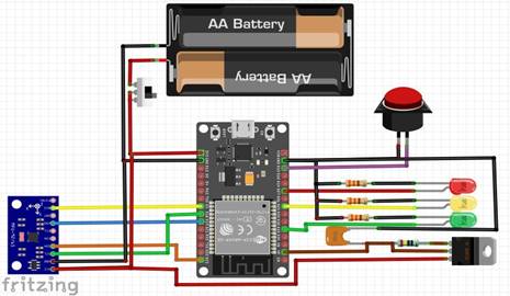 In this design, the ESP32 will be in charge of establishing the sampling frequency of the sensor signals and their transmission via WiFi to the computer. The battery will allow portability, while the regulator will allow monitoring to determine its charge. A button with two functionalities will be used: when not transmitting, when pressed, the LEDs will show the battery status, and when transmitting, it will be used to stop the process and wait for new instructions.