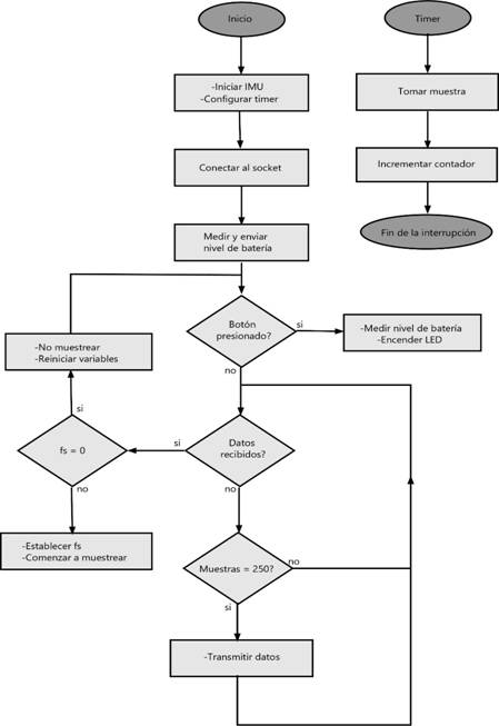 Abstract: In order to automate the determination of gait parameters, a system capable of acquiring data from inertial units, exploiting their maximum sampling frequency, was developed. The study of gait is one of the fundamental indicators for the evaluation of physical performance. It allows the estimation of the functional deterioration of the elderly in an objective way, so several tests have been designed to evaluate it. The system developed has two fundamental elements: an electronic device and a desktop application. The electronic device has the function of collecting data from the MPU-9255 sensor using an ESP32 to set the sampling rate, transmitting the data via WiFi to the computer and monitoring the system's battery. The desktop application allows the electronic device to be configured and controlled, as well as receiving, displaying and storing the data. As a result, a prototype capable of operating at a sampling frequency of 1 kHz was built. Tests carried out on the system demonstrate its reliability and allow the limits of sampling frequency and working distance to be set.