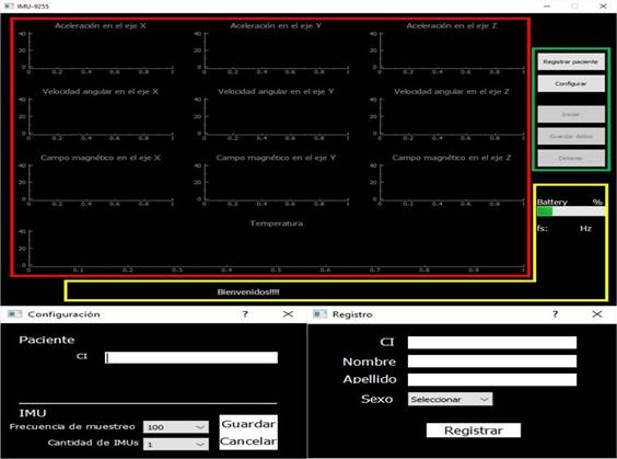 Main window: where the graphs of the acceleration, gyroscope and magnetometer values (3 axes), as well as the temperature are displayed. In addition, it has the buttons to control the system and to display the configuration menu and the registration menu.