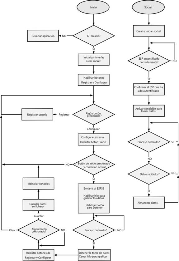 The flow of the application is handled by two threads: a main thread in charge of maintaining the visual interface and controlling the events that are executed on it; and a secondary thread, using the Threading module (Python module that allows the concurrent execution of code), to carry out the other functions, such as graphing, updating the battery level on the screen, detecting the disconnection of the ESP32, etc. Figure 4 shows the algorithm of the desktop application.