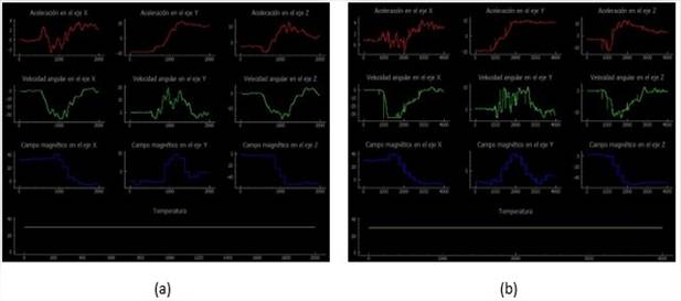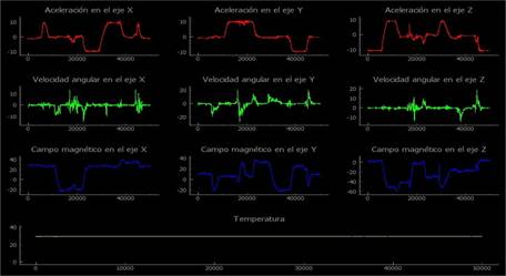 The first test performed was to check the work at the sampling frequency of 1 kHz. First, the magnetometer data were validated. For this, one of the magnetometer's axes was oriented towards magnetic north and data collection was started. Then, the sensor was moved in known directions. To validate the accelerometer and gyroscope data, the sensor was placed in the rest position and movements in known directions were started, but this time, varying the acceleration of the movement to check the state of the gyroscope. The results were as expected. Figure 5 shows the graphs of the tests performed.
