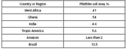 A more detailed classification can be found in the reference Classification and Cartography of Soils. 2020. (Presentation of the two main soil classification criteria SOIL TAXONOMY (USDA) and WRB SYSTEM, former FAO-UNESCO by Margarita M Alconada Magliano). Currently the most universally accepted denomination is plinthite and it is included with petroplinthite in the soils called plinthosols. Although some authors still call it laterite [7]. Plinthite differs from residual lateritic soils, among other things, in that it hardens irreversibly and two types of hardened soil can form; petroplinthite or pisolite. Petroplinthite is a continuous, fractured or broken sheet of connected, strongly cemented to hardened nodules or mottles. Pisolites are strongly cemented to hardened discrete nodules. Both petroplinthite and pisolites develop from plinthite by hardening. These soils are known as: Groundwater Laterite Soils, Perched Water Laterite Soils and Plintosols (Brazil); Sols gris lateritious (France); and Plenteous, Plintacualfes, Plintoxeralfes, Plintustalfes, Plintacuultes, Plintohumultes, Plintudultes, and Plintustultes (United States of America). [8-10]. It is estimated that there are 60 million hectares of Plintosols on the planet and they are associated with other residual soils such as Ferralsols, Acrisols and Alfisols [11-13]. The distribution of plinthite is very pronounced in West Africa, America, India and Western Australia, as can be seen in Table 2.
