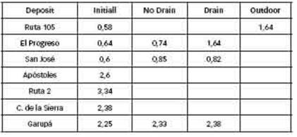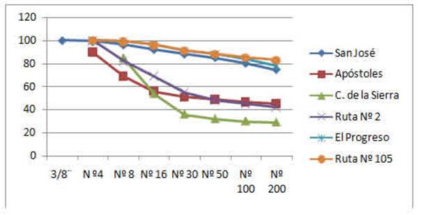 Once the deposit exploration phase was concluded, the granulometric composition and natural humidity of each material extracted from the following previously described deposits were determined: San José, Apóstoles, C. de la Sierra, Ruta N” 2, El Progreso and Progresiva 6200 of Road No. 105.
