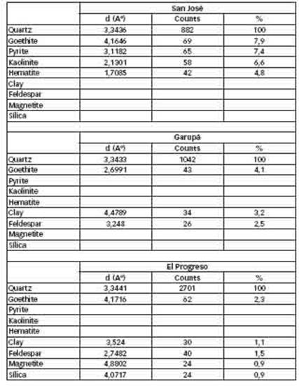 In order to investigate the reasons for the dispersion of behaviors in the self-cementation of the different samples subjected to the different processes, X-Ray Diffraction analyzes were performed on three samples corresponding to the San José, Garupá and El Progreso deposits. The synthesis of these analyzes in which the number of counts in the most important peaks of the identified substances is included in Table 5.
