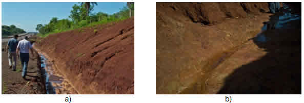 On its trace, several sectors have been surveyed in which plinthite has been found; in progressive 6100, 6200 and 8000, being progressive 0 of the same road, the intersection with the By Pass roundabout. In this progressive 6200 location, the plinthite is found on the slope and lateral ditch of the left road, which has been excavated in August 2013. The characteristics of the place can be seen in Figure 11. This deposit was not dimensioned since, like the Garupá one, it is located in an unaccessible area for prospecting, considering that the road was built in the place. However, samples were taken for laboratory testing and also natural weathering tests with natural density and loose density were performed in the sampling site which was not altered during the test period.