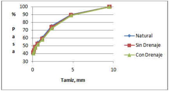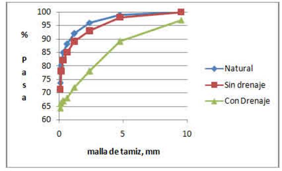 The sample from El Progreso deposit was subjected to the two cycles; without drainage and with drainage. The results can be observed and compared in Figure 14. The difference in the granulometric changes between the treatments with and without drainage can be noted, where the percentage of grains smaller than 5 mm is much higher in the case of cycling with drain versus cycling without drain. Cycling without drainage practically did not modify the granulometric distribution with respect to the sample collected in the natural state.