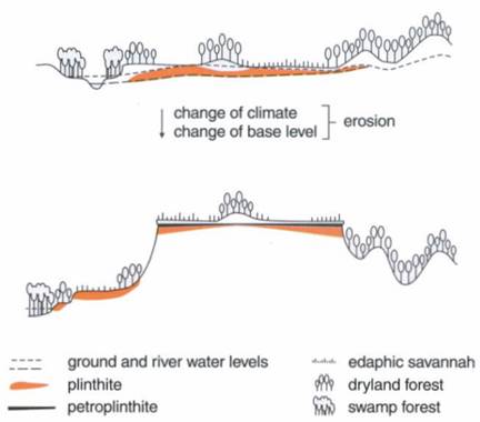 Soft plinthite is preferentially detected in rain forest areas, while skeletal and petroplinthic soils are more common in savannah environments (greater aridity).