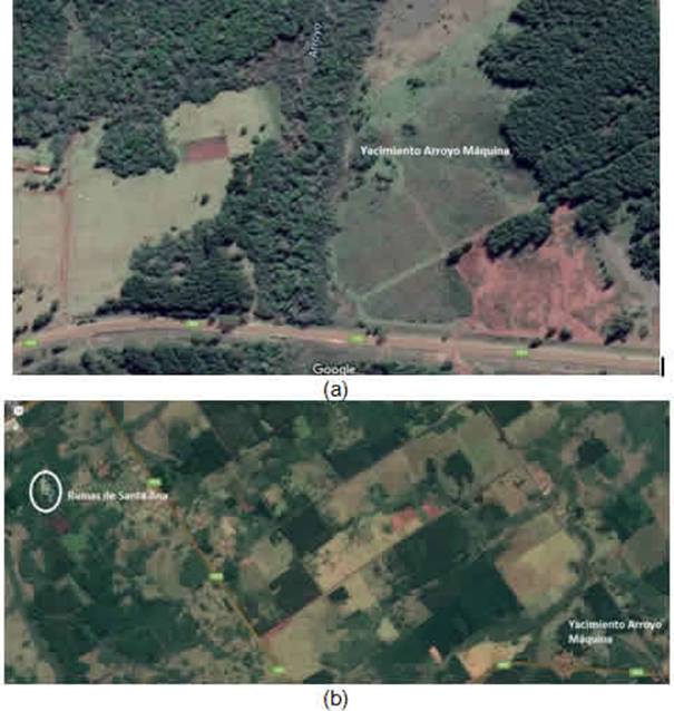 Search of Plinthite deposits were performed in the southern area of the Province of Misiones, more precisely in the vicinity of the different Jesuit reductions. These are the deposits called San José, Apóstoles and Concepción de la Sierra. The new deposits found in the exploration carried out in this work are called: Provincial Coastal Road No. 2, Barrio el Progreso, National RoadNo.105 and Garupá. In the latter, due to its location, its dimensioning was not carried out. In addition, other deposits are known that are not included in this investigation, such as the one called Arroyo Maquina located at coordinates 27° 24'29.8" S, 55° 30'57.6" W and whose aerial photograph is shown in Figure 4, where an area of exposed plinthite can be observed, either due to the removal of vegetation and natural erosion or caused by the use of the land for agriculture. In addition, its proximity to the Ruins of Santa Ana, located in the town of the same name suggests that this depositwas probably used for its construction.
