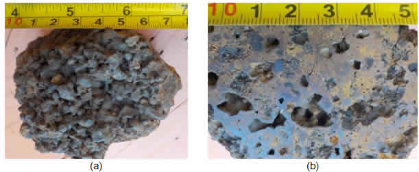 A typical sample of petroplinthite is presented in Figure 5. Figure 5a corresponds to a surface exposed to the environment, where it can be seen the mottled ferruginous part. Figure 5b shows a view of a polished interior cut, where it can be seen grayer parts corresponding to the motes of iron oxide, which acts as a reinforcement of a natural compound, in a matrix of a softer material, also a considerable amount of macroscopic pores are observed.