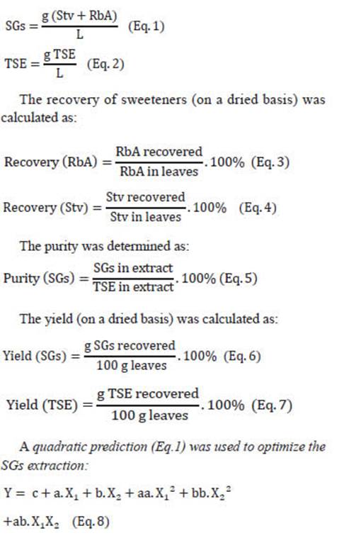 The variables determined in the extracts were: concentration (g/L), recovery of sweeteners (%, dried basis), purity (% of crude extracts) and yield (on a dried basis).