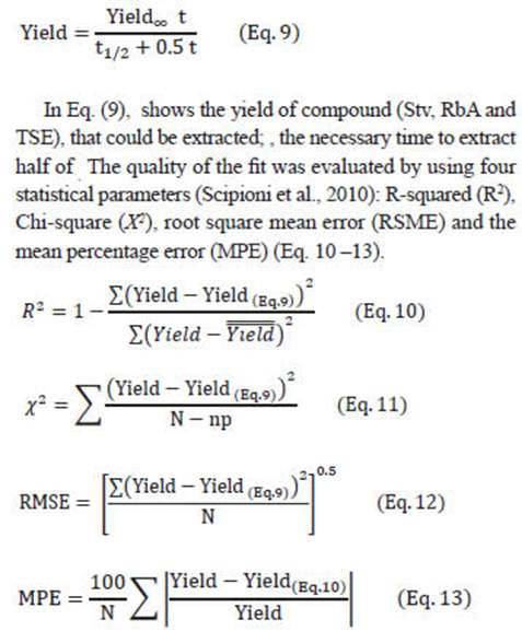 According to the model, high values of t1/2 indicate a low recovery rate of compounds. The highest value of 𝑡 1/2 was obtained for TSE with 70% of ethanol at 70°C (68.6 min). SGs showed the lowest 𝑡 1/2 values, in 35% of ethanol at 70°C, 27.9 and 28.9 min for Stv and RbA, respectively (Table 3).