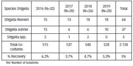 When analysing our results, we observed that the same pattern of species shown by developing countries is maintained, as reported for other Latin American countries [19-21] and other Argentine provinces [11, 17, 22-25] in the years 2020, 2019, 2017, 2012 and 2007 respectively, where S. flexneri predominated with a percentage between 60 and 70%, followed by S. sonnei.