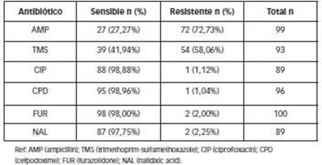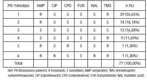 The high resistance detected for ampicillin and trimethoprim-sulfamethoxazole and almost nil for ciprofloxacin is similar to surveillance results reported by the WHONET- SIREVA II Network (2020) for the period 2010-2019 as well as with different studies from Argentina [11, 23], Ecuador [20] and Peru [21].