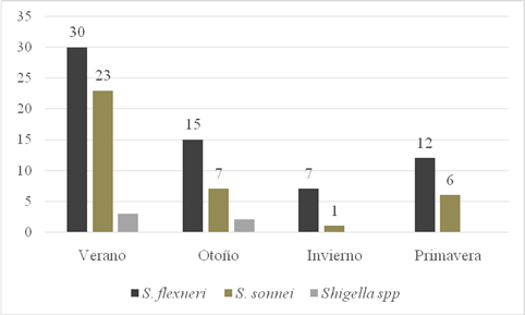 In general, the literature reports that most cases of Shigella occur in the warmer months [11, 31] in agreement with our findings.