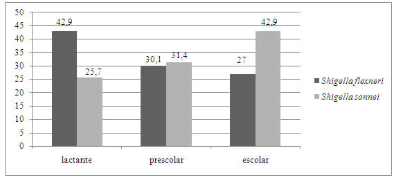 Ninety-eight patients were outpatients and 8 (7.5%) required hospitalisation for treatment. There was a marked predominance of shigellosis in outpatients; between outpatients and those requiring hospitalisation for treatment, there was no statistically significant relationship with age group (p=0.5161). However, we found that S. flexneri predominated strongly in the infant group and S. sonnei in school children (Figure 2).