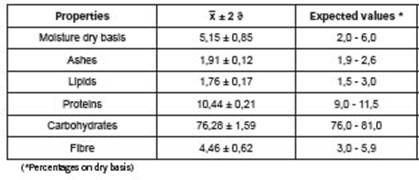 The total carbohydrate content was obtained by the percentage difference between all the above-mentioned constituents (moisture, ashes, lipids, proteins and fibres) and the total (100%).