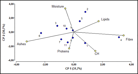 In this figure, each point represents a sample and each vector a variable. The ashes and fibre variables have a strong influence in discriminating the data set given the higher modulus of the vectors. In this analysis, it can be seen that Principal Component 1 (PC1) is positively related to lipid, fibre and carbohydrate content and negatively related to ashes, protein and moisture content. Principal Component 2 (PC2), on the other hand, is positively related to moisture and lipid content and negatively related to protein, carbohydrate and ashes content. It could be mentioned that the fibre content is almost neutral with respect to this component.