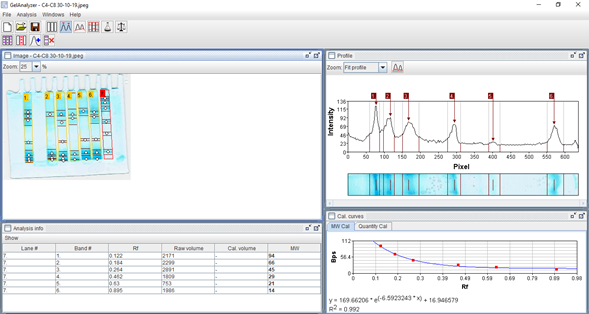 Polyacrylamide was formed using a 15 %v/v run gel (pH 8.8) and a 12 %v/v stacking gel (pH 6.8). The resolution lengths were 50 and 15 mm for the run and stacking gels, respectively. A BioRad model 1653301 (Bio Rad Laboratories Inc Hercules, CA, USA) was used. The gels were developed after staining with Coomassie Brilliant solution in methanol. PB-L Bio-Logic products were used as molecular weight markers. INDIGO Pre-stained Protein Marker. Cat. No MC01. SDS-PAGE analysis was done using GelAnalyzer1.0 software (28).