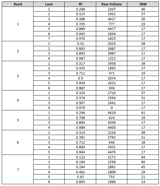 As documented in Figure 2, all samples have proteins with molecular weight below 45 kDa, approximately 40 kDa, which is crucial as this fraction favours foam formation. In samples 1, 4 and to a lesser extent 3, there are 29 kDa fractions, this is not the case for samples 2 and 5. Sample 2, on the other hand, shows a lower fraction resolution, which would indicate a similar concentration of all molecular components. Each sample has a high concentration of low molecular weight polypeptides, fractions below 14 kDa. The results of the determination of the molecular weight fractions can be seen in more detail in Table III.